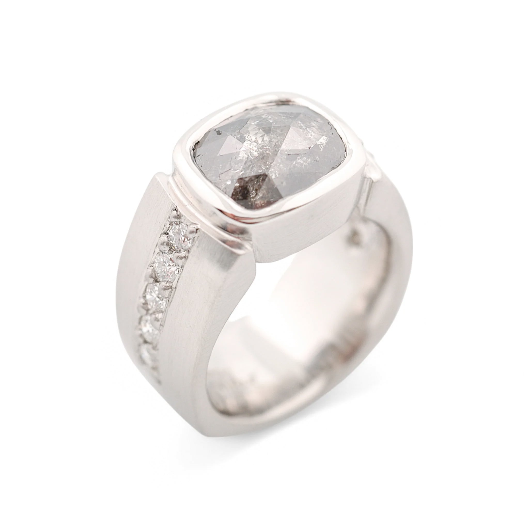 Custom Palladium band with bead set white diamonds and 3.9 ct. Rose Cut Salt and Pepper Diamond center stone in polished full bezel setting.