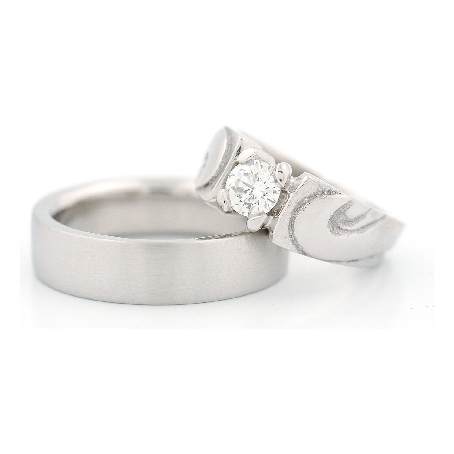 Custom Palladium bands. Carved engraved with 4 prong solitaire round white center diamond. Brushed finish band.
