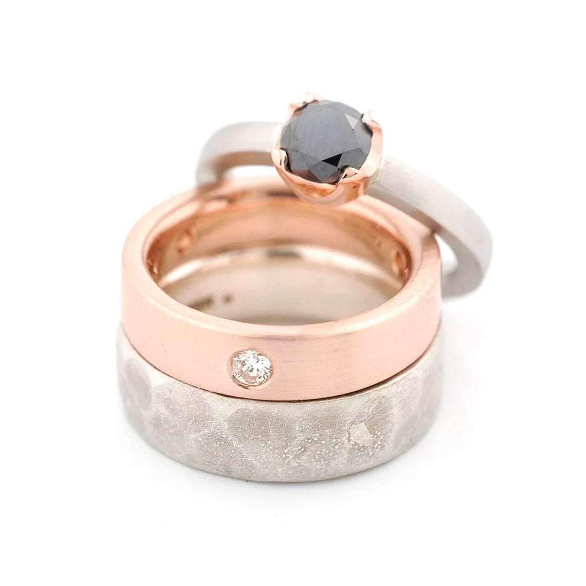 Platinum Sterling textured band with 14K Rose Gold brushed band, Palladium brushed band with copper 4 prong set Black Diamond center stone, flush set round white diamonds.