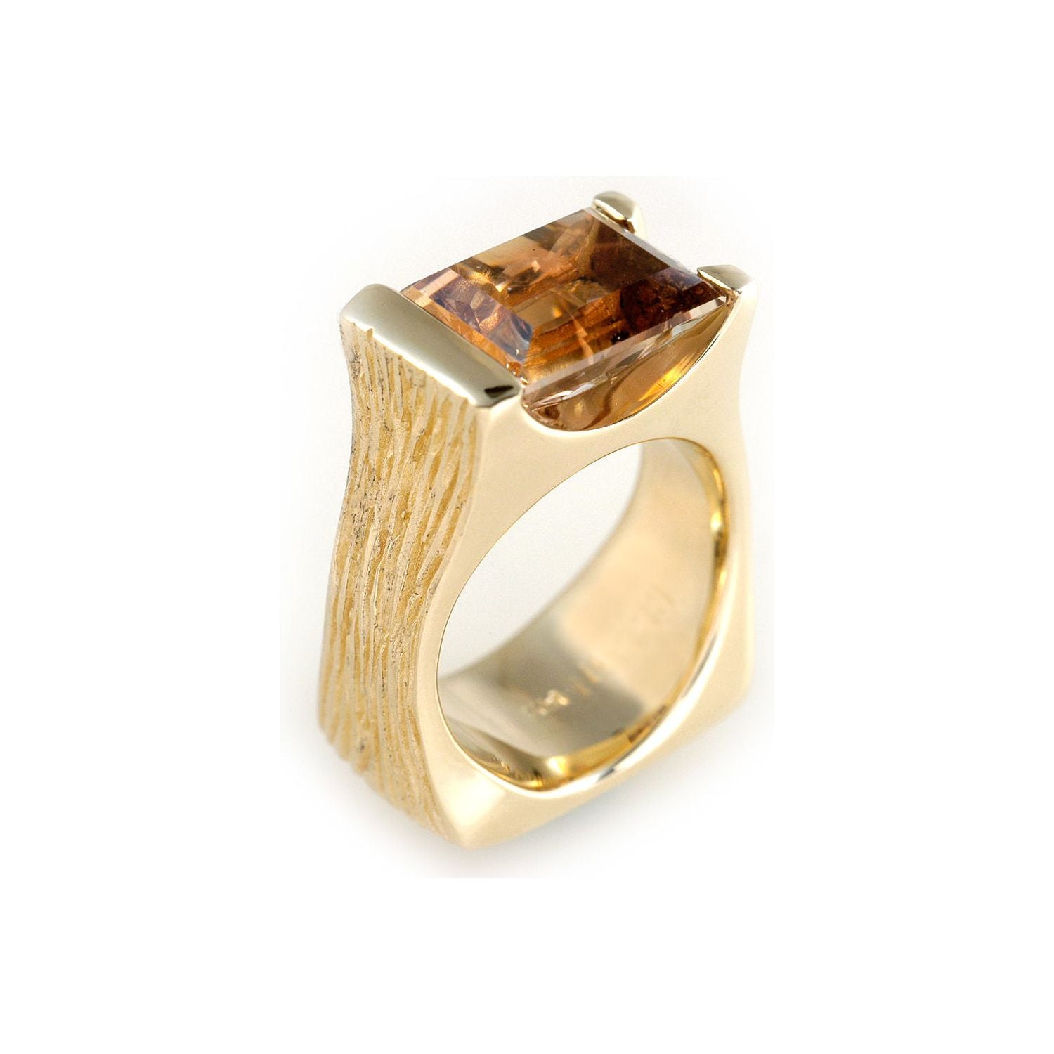 Custom yellow gold band, partial bezel set faceted Topaz, high polish edges and custom created textured, square, comfort fit, tapered, wide band.