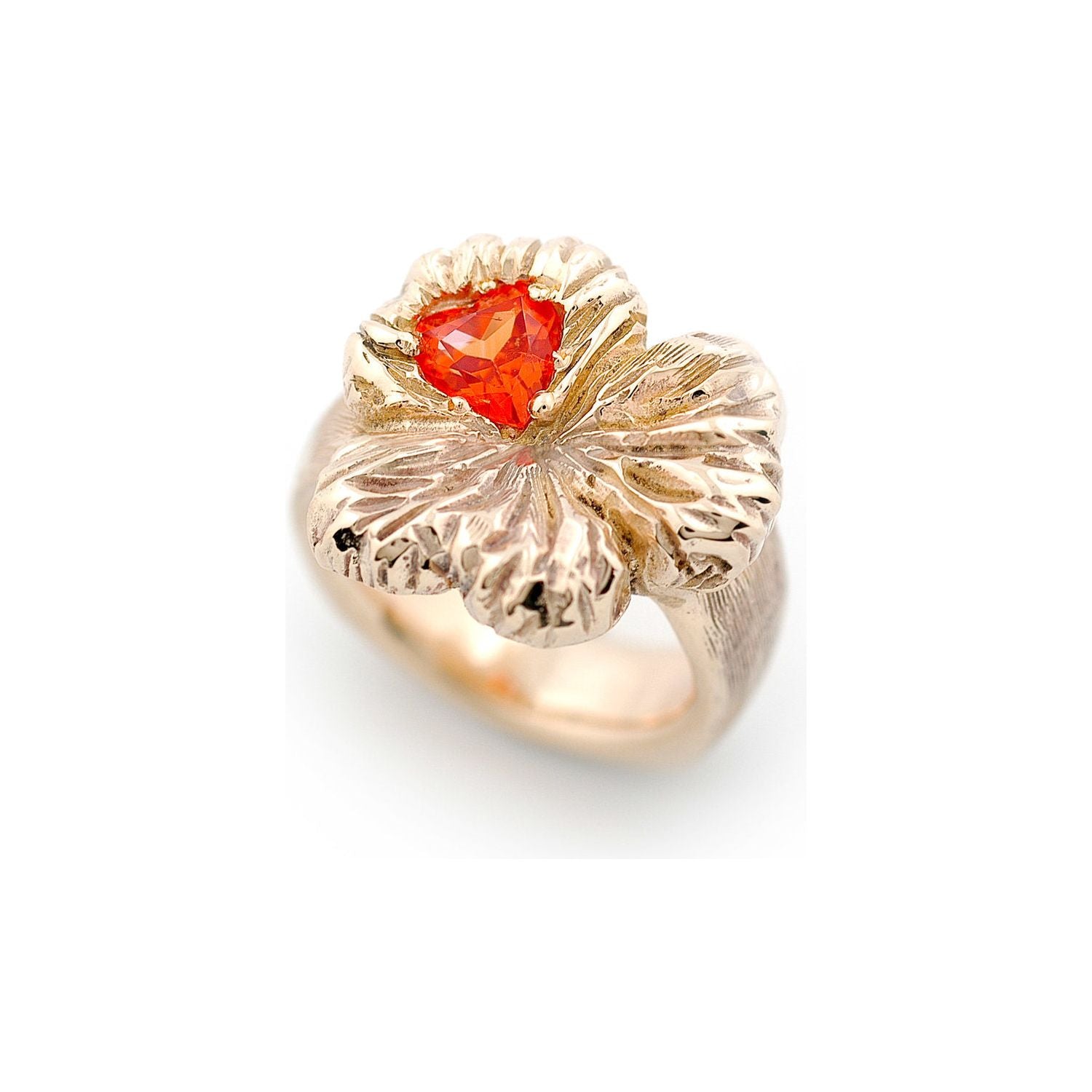 Custom 14kt yellow gold carved and cast flower ring. Textured and brushed, with bead set, heart shaped, orange sapphire.