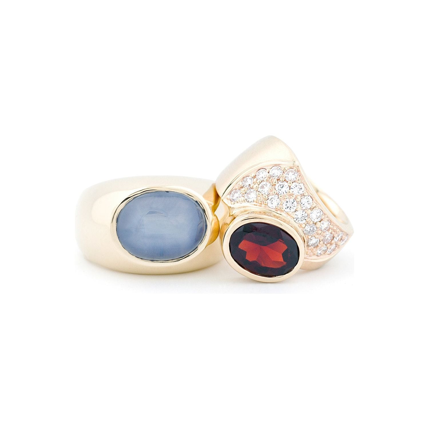 Custom asymmetrical 14kt yellow gold band with pave set round white diamonds, and off-center bezel set large, faceted garnet. High polish, wide, men's band, with flush set round large blue star sapphire center stone.