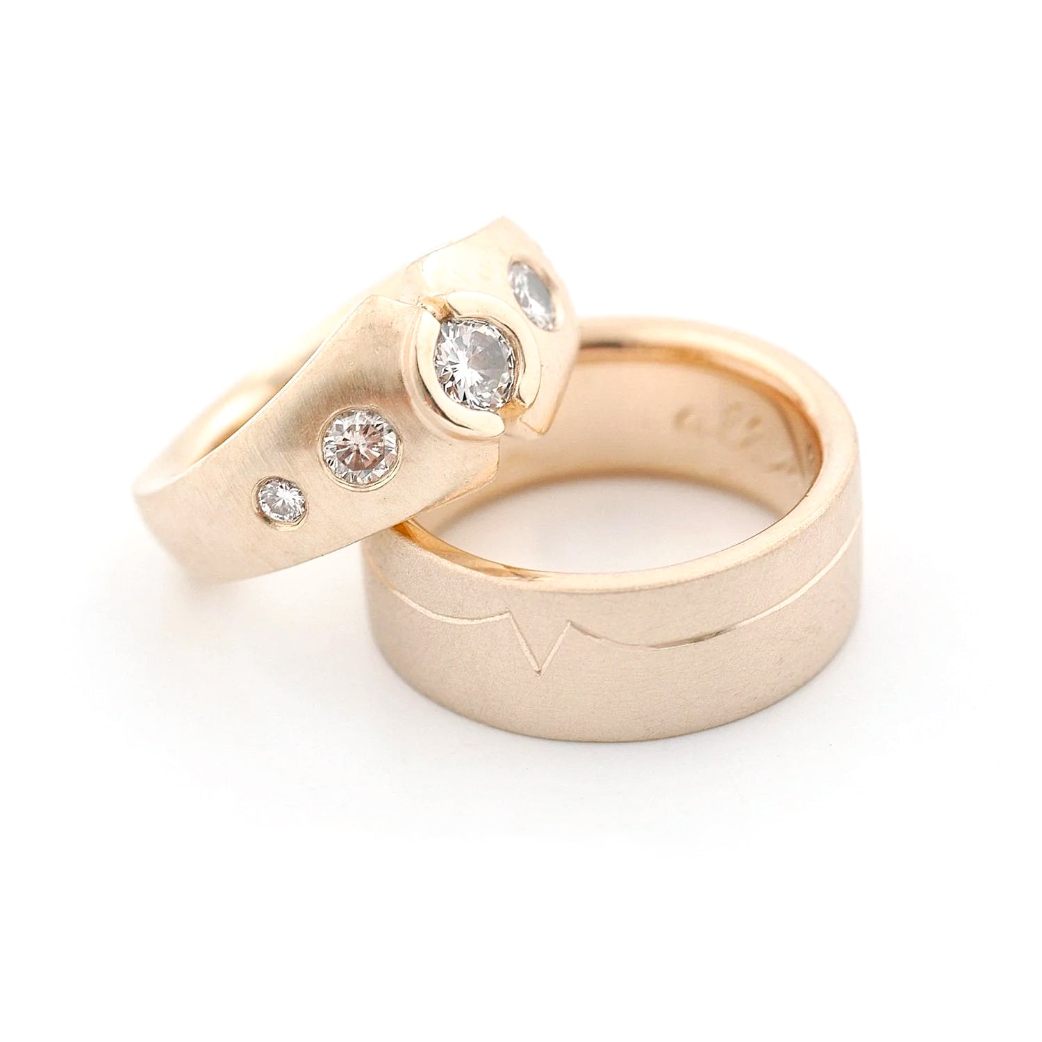 Custom designed his and her matching 14K Yellow Gold bands one flush set with white Diamonds. The outline of her ring is the engraving line on his ring!