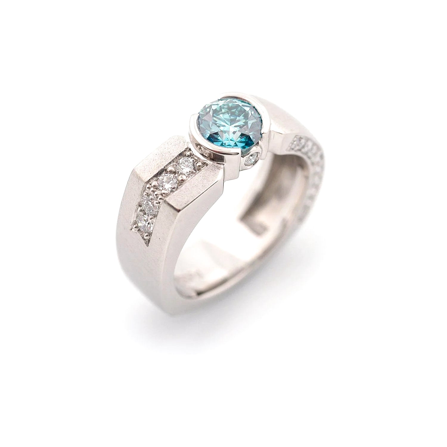 Custom designed unique angular and modern Palladium band set with turquoise blue diamond round center stone and white diamond accents.