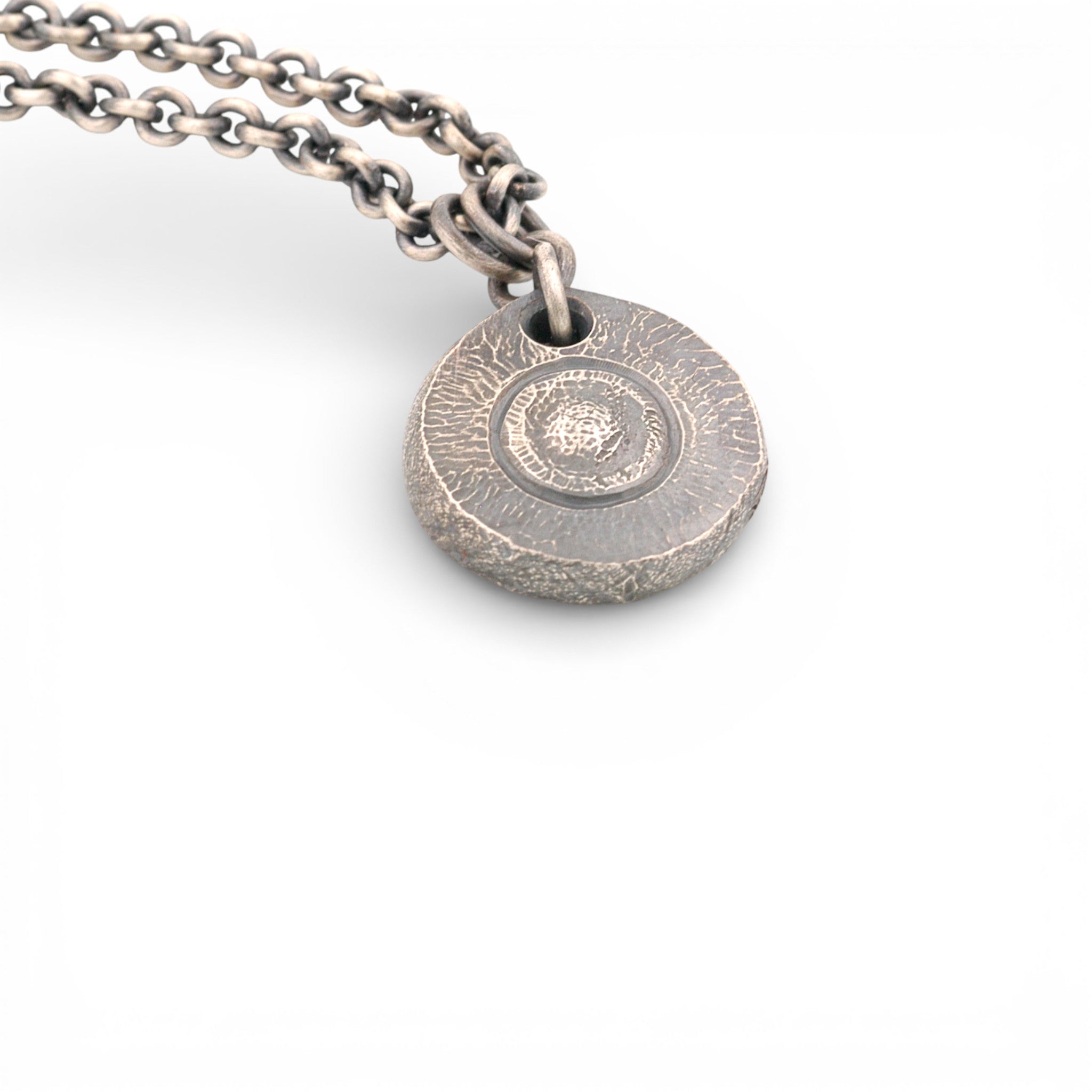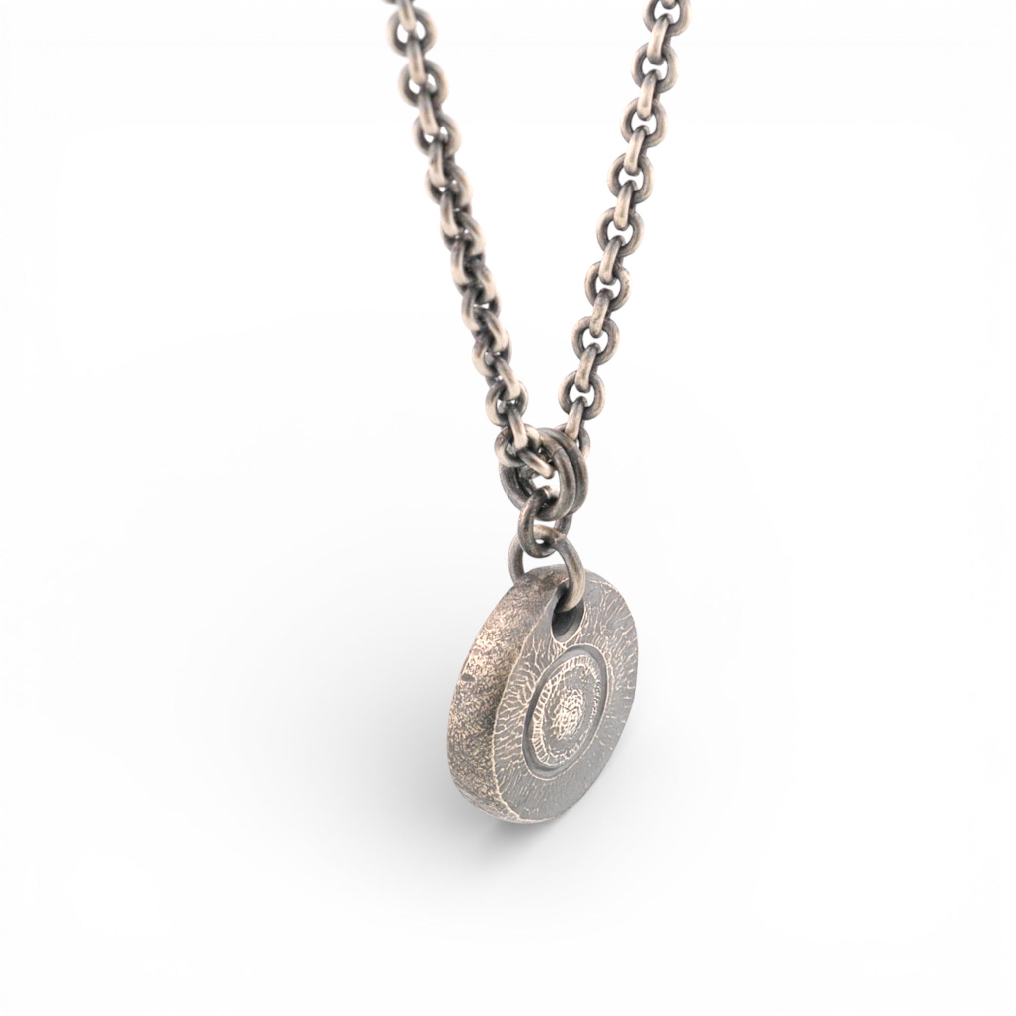 Forged Series Sterling Silver round pendant with oxidized and brushed finish and sweet look as a shell.