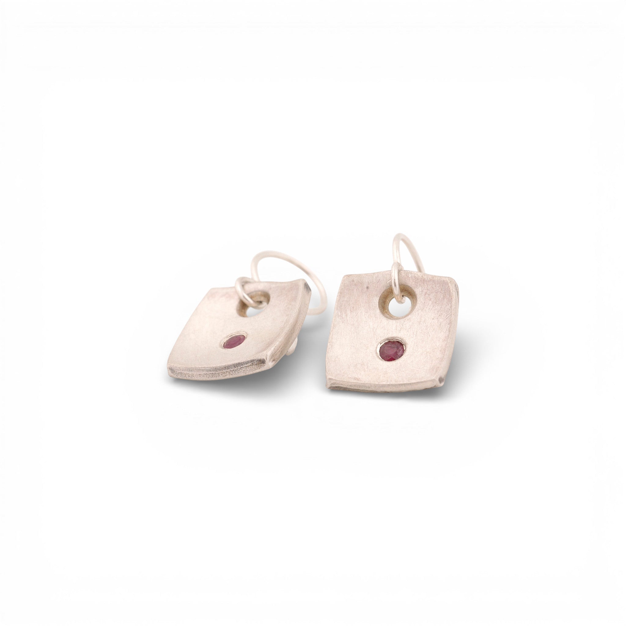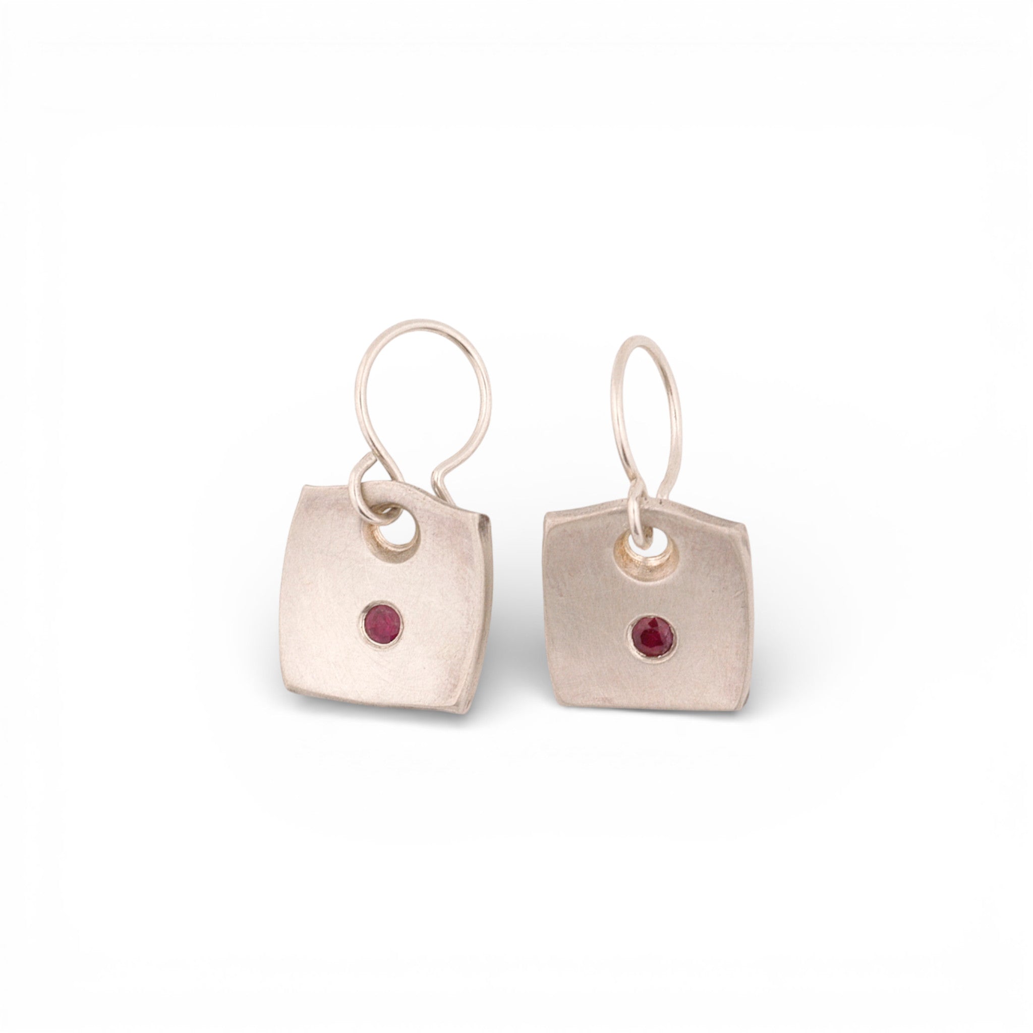 John Paul Designs Forged Series sterling silver square tile earrings, with flush set perfect rubies. Come on Sterling Silver spring form ear wires, oxidized for accent and brushed finish.