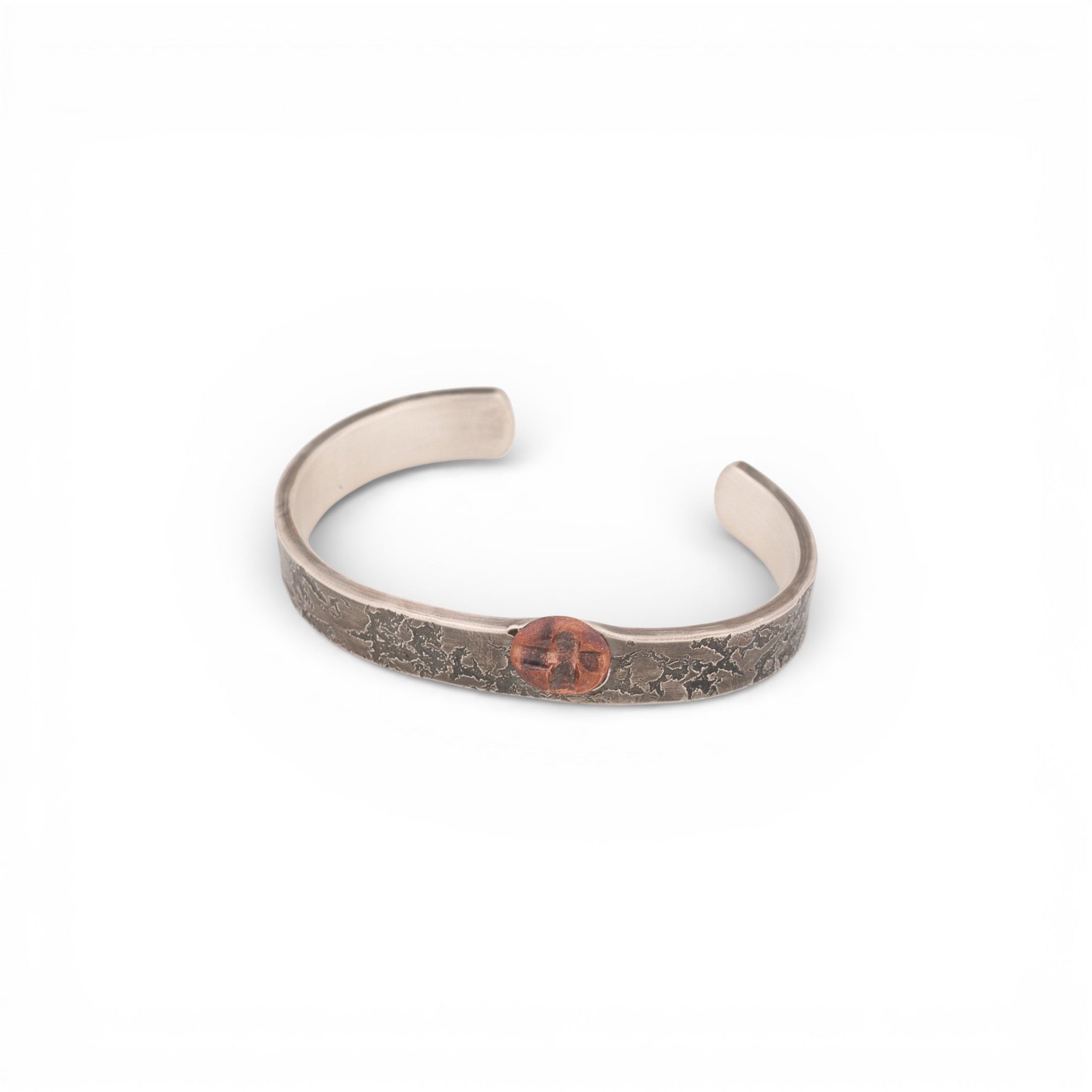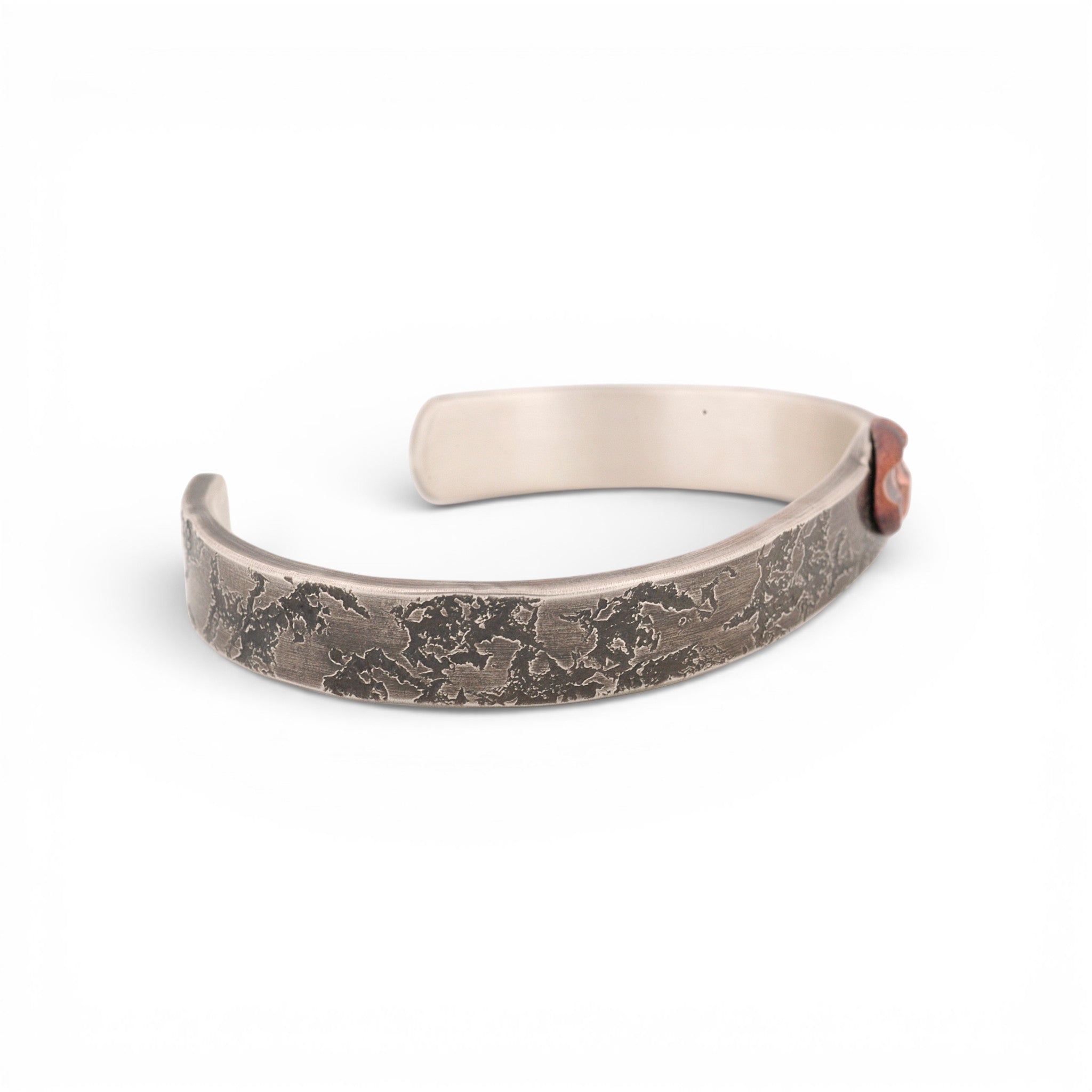 Unique textured oxidized sterling silver cuff with a big copper rivet and a stamped design.