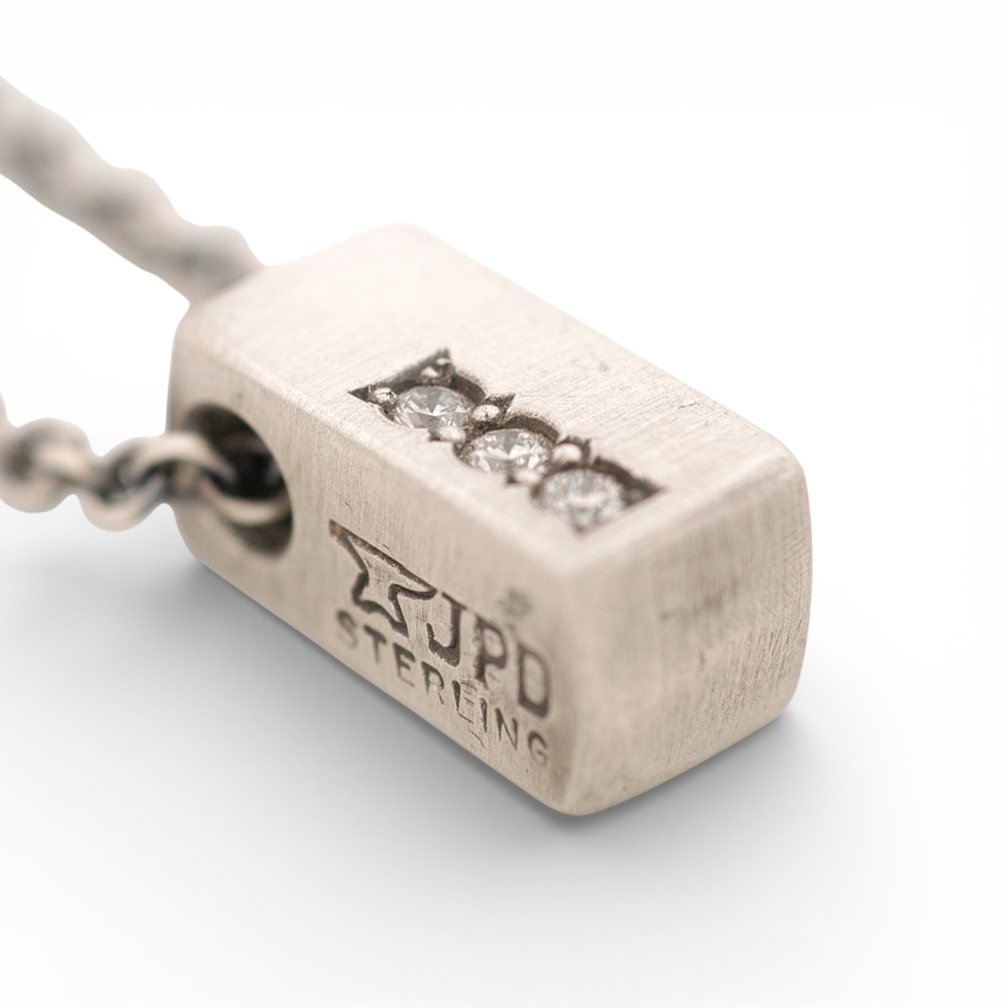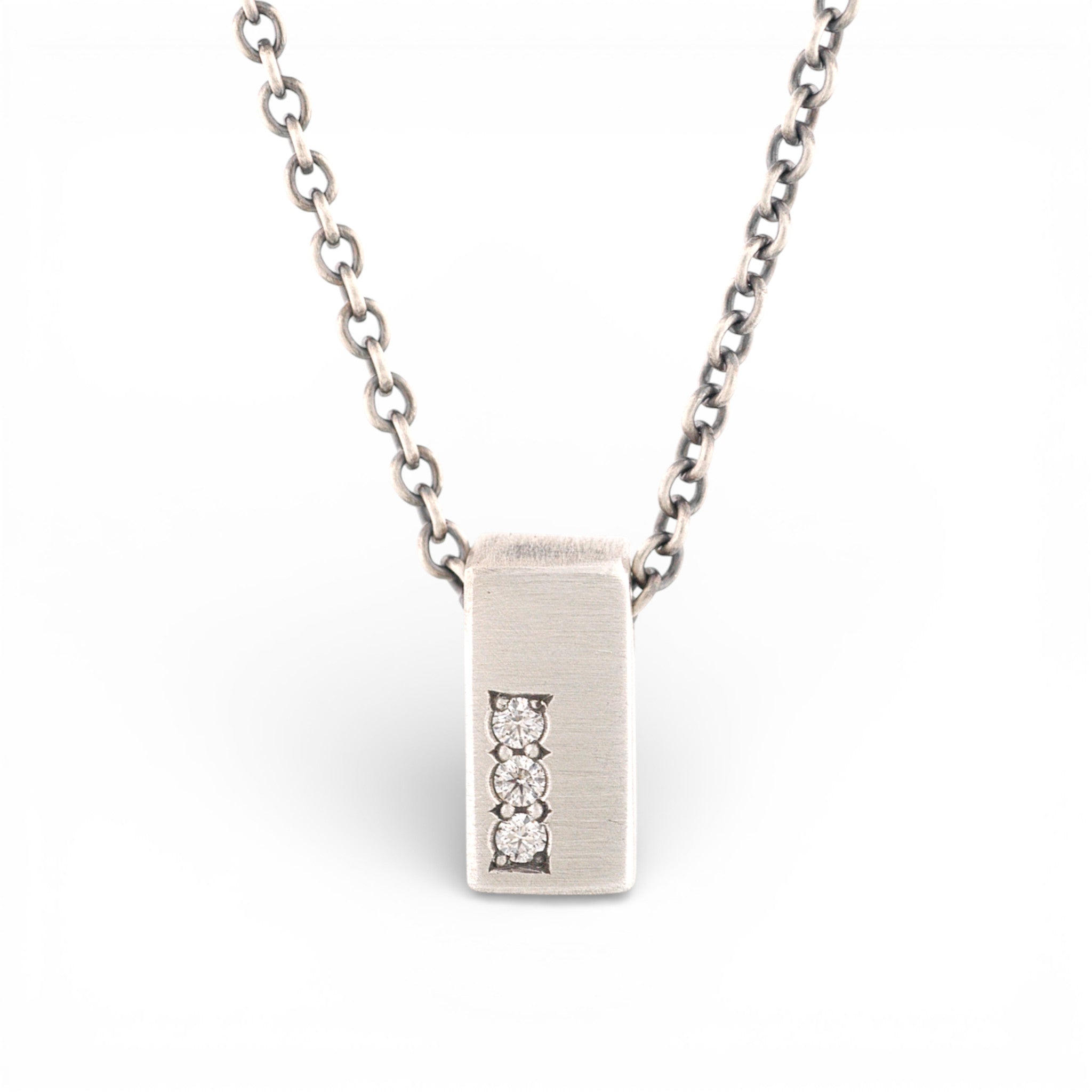 Hand-forged sterling silver pendant, with 3 offset bead set ideal cut diamonds. Perfect for any occasion!