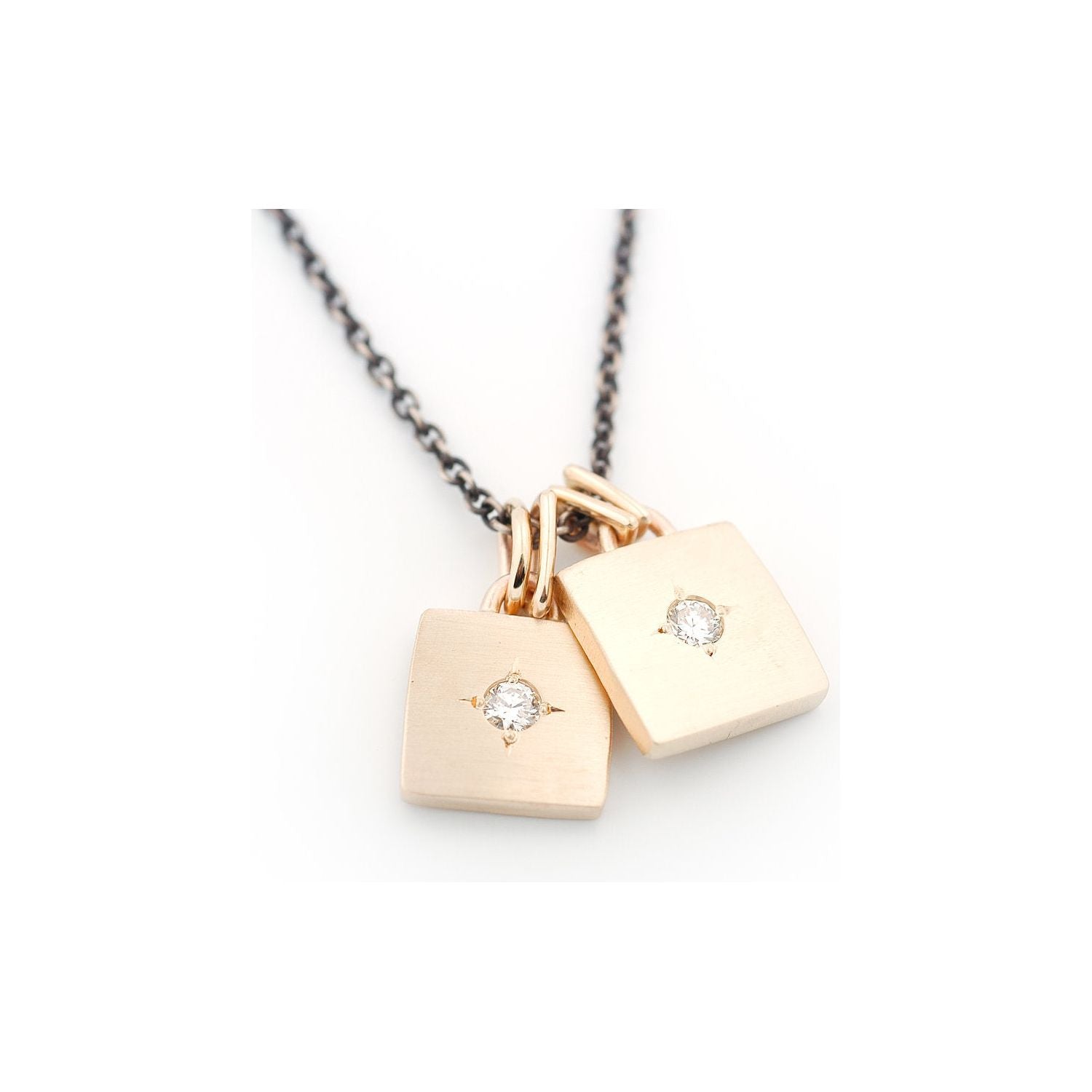 Forged 14KT yellow gold tiny square pendants with center bead-set, round, white, recycled diamonds.