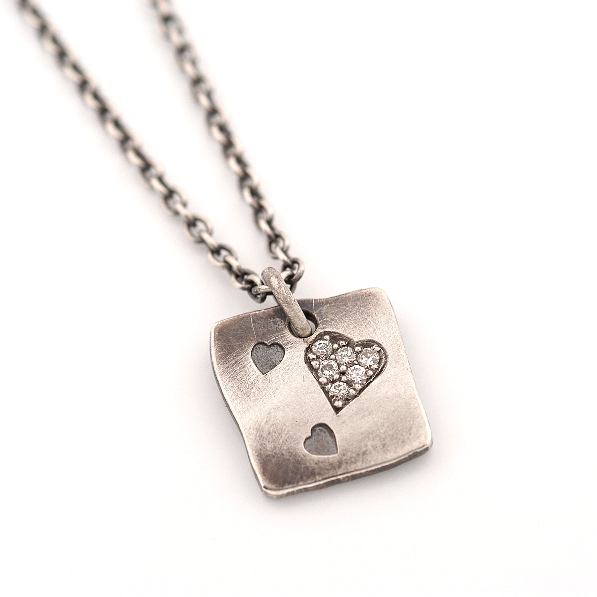 Hand-forged sterling silver tile pendant, hand stamped with hearts and flush set with ideal cut diamonds, oxidized and brushed sterling silver cable chain.