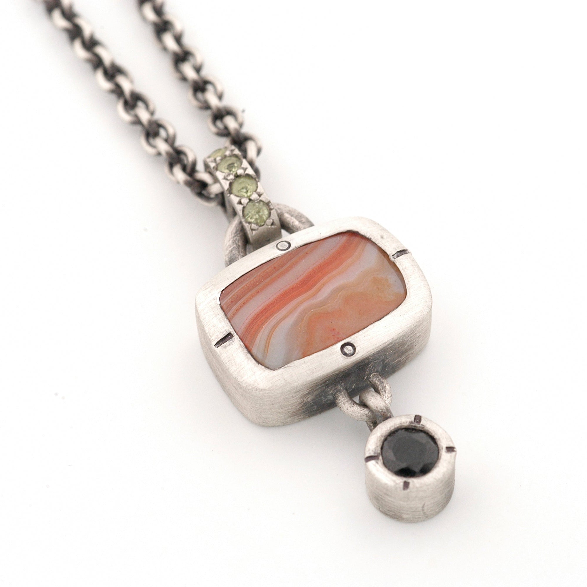 Hand fabricated sterling silver, sardonyx, peridot, black diamond.