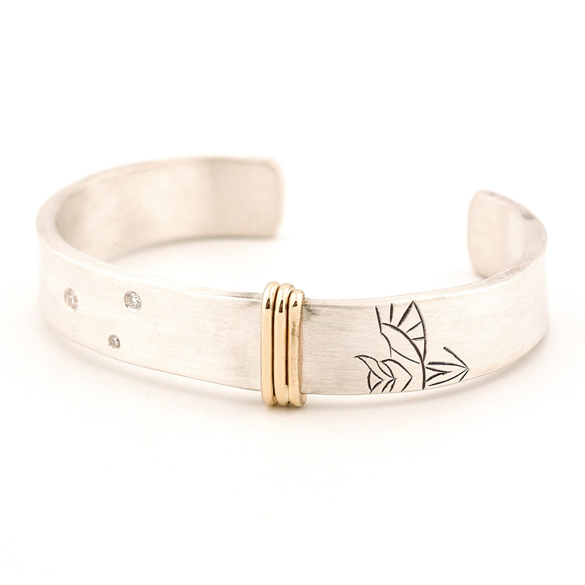 Hand-forged sterling silver bracelet, flush set ideal cut diamonds, wrapped with yellow gold,personalized with a hand engraved owl, brushed, satin finish.