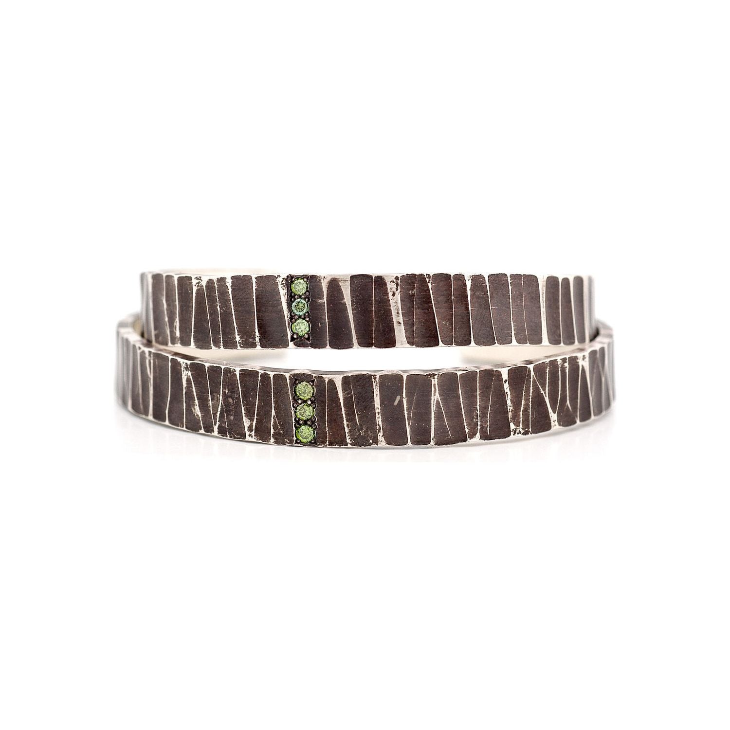Hand forged, textured & oxidized sterling silver with green diamonds.