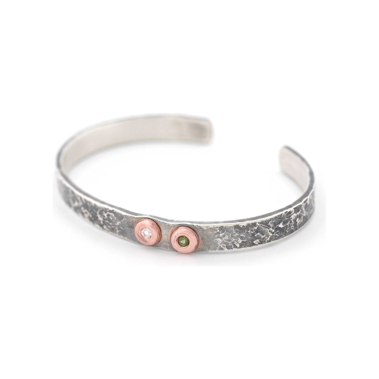 Custom textured and oxidized sterling silver cuff featuring a round white diamond and green tourmaline set within two copper rivets.
