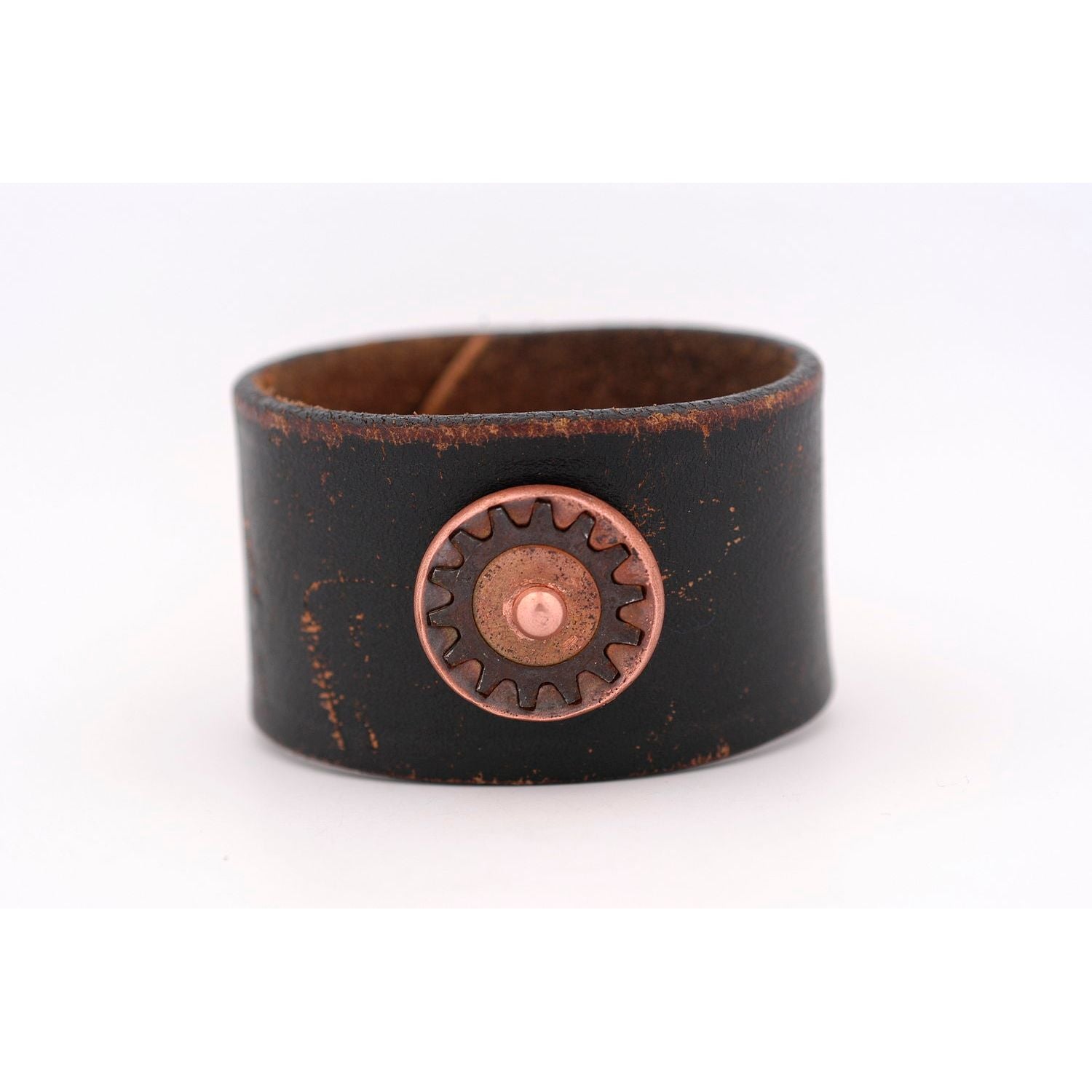 Wide large leather cuff, with riveted forged copper circle emblem.