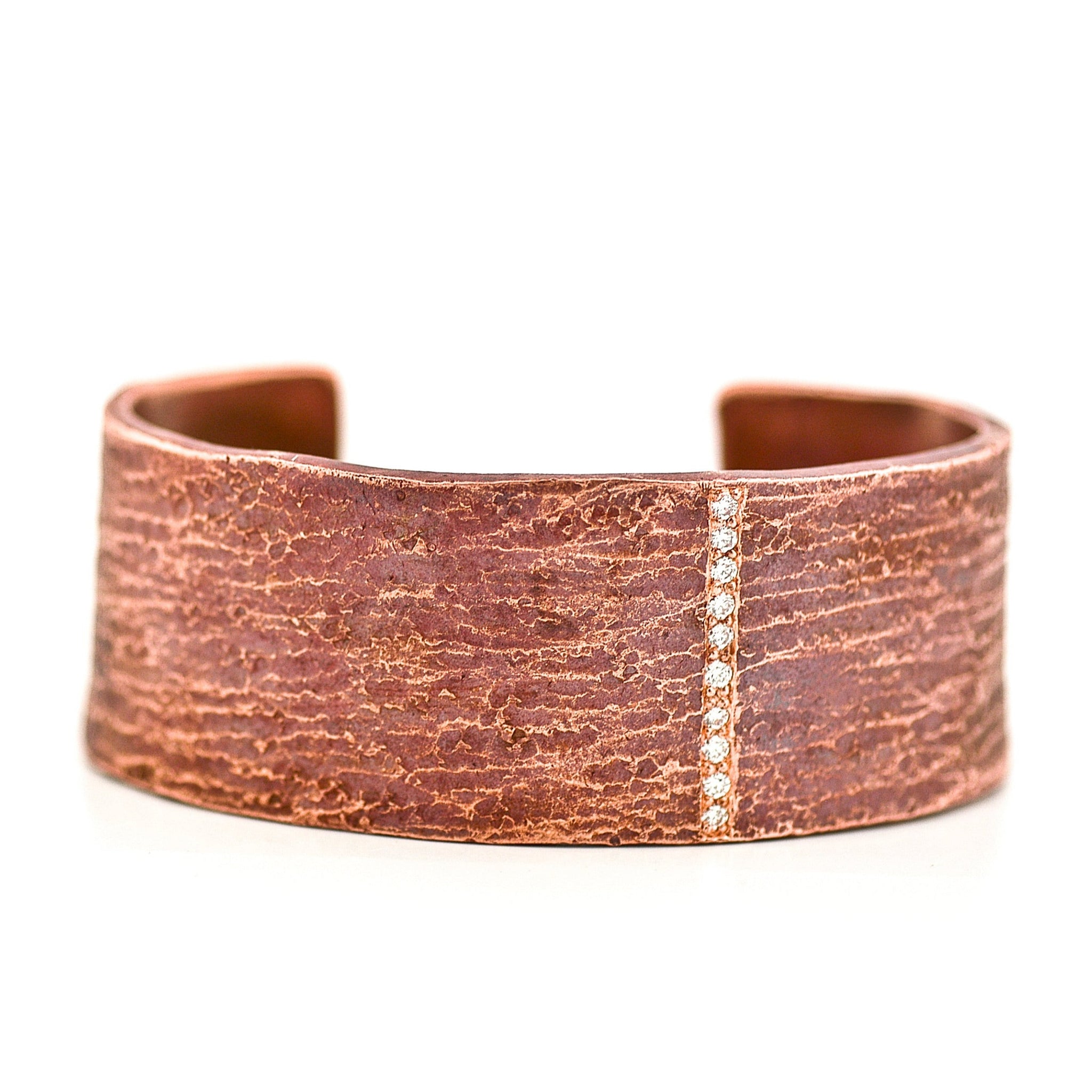 Copper cuff with a unique patina finish and hand-hammered bark texture with a row of brilliant ideal cut Diamonds.