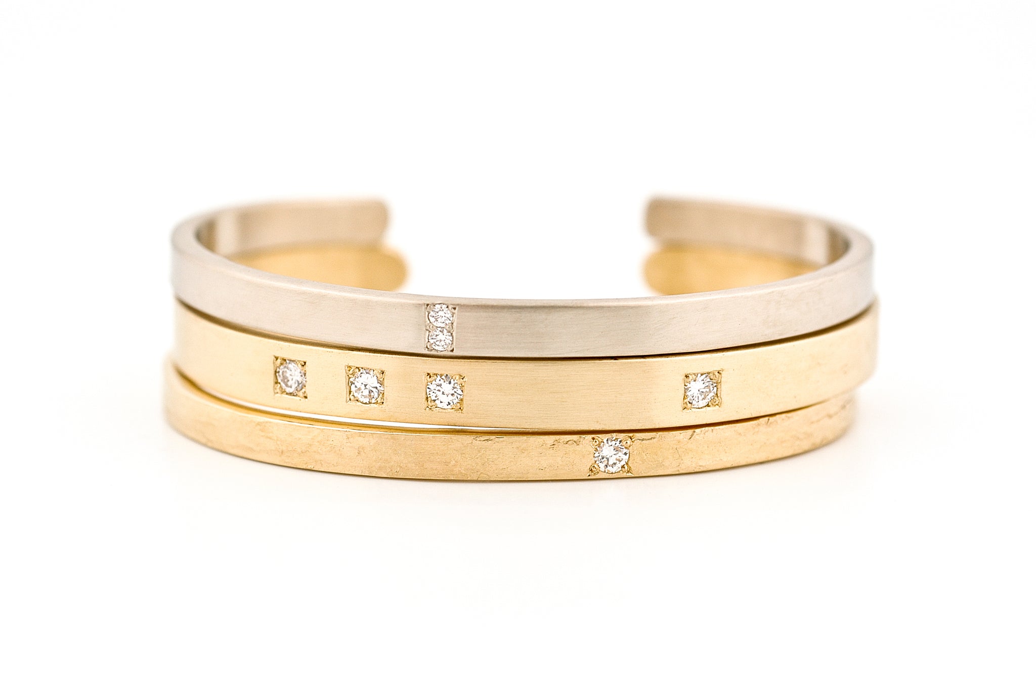 Sterling Silver and 14k Gold Hand Forged Cuffs with ideal cut diamonds.