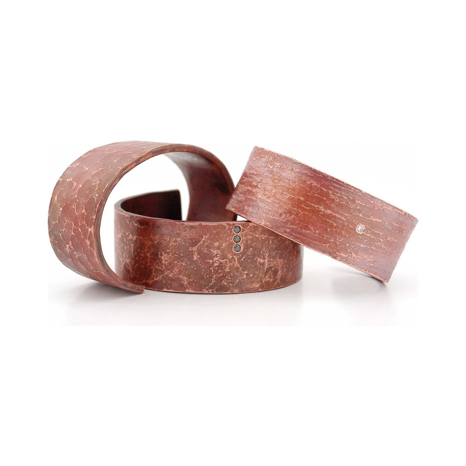 Hand forged and textured copper with black and white ideal cut diamonds.