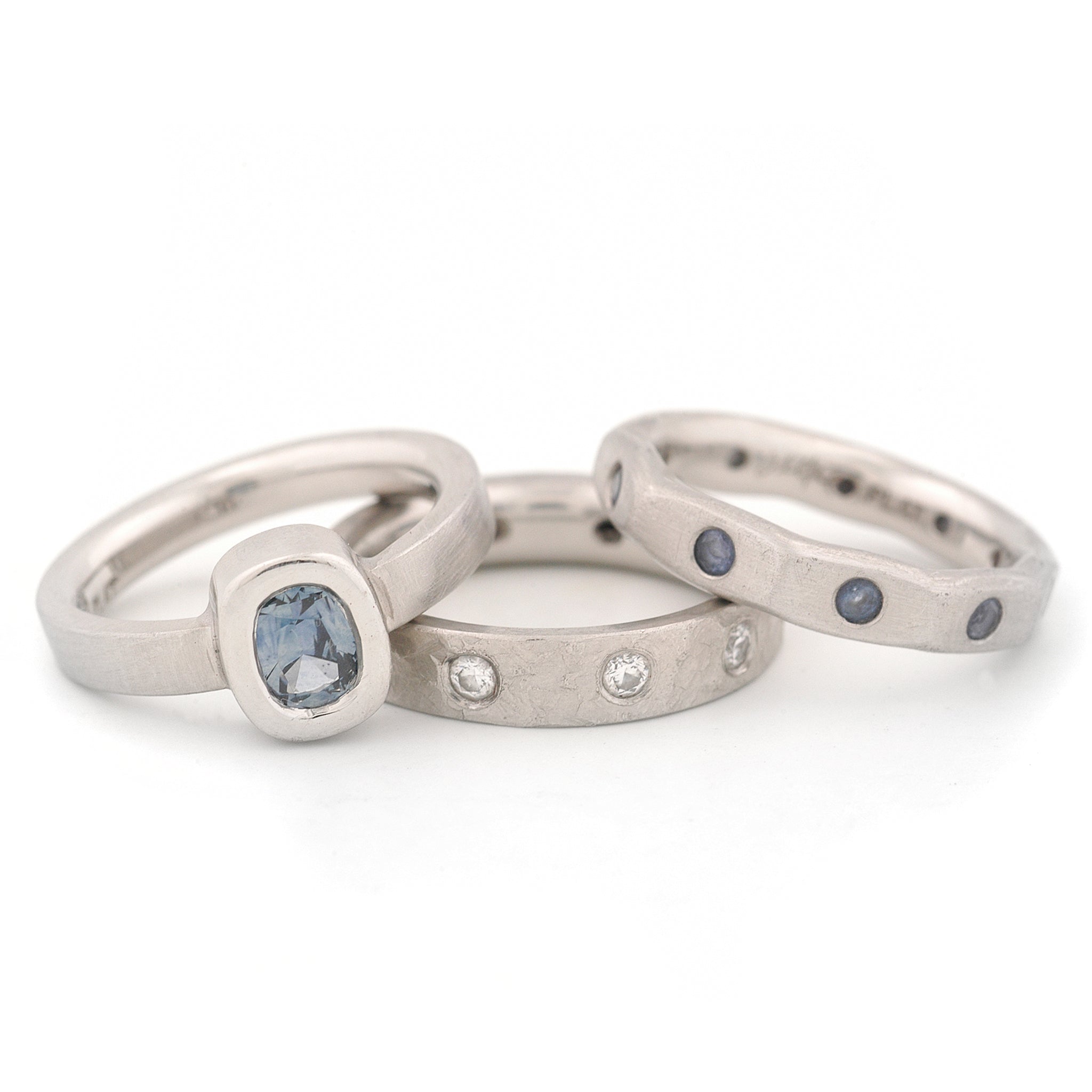 Platinum and sapphire engagement ring, paired with with Yogo Montana sapphires, and ideal cut diamond wedding set.