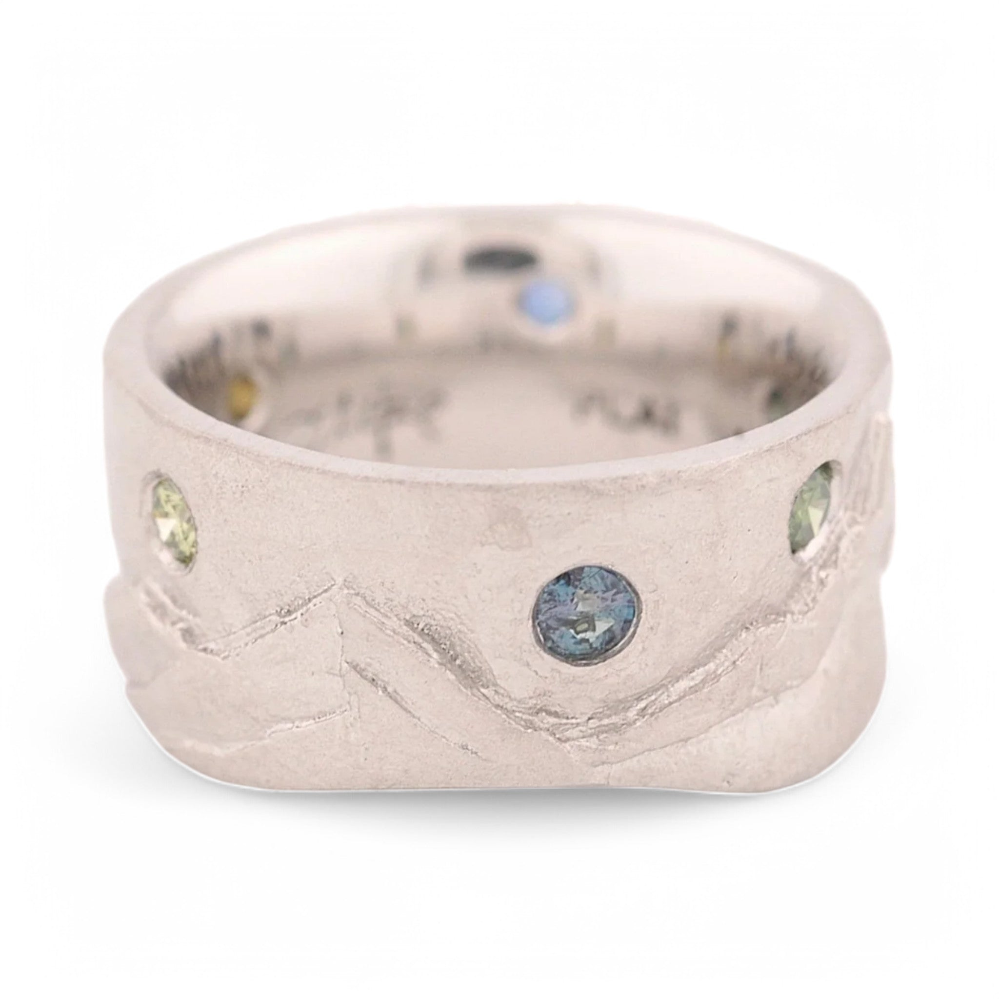 Platinum 3 mountain ring, 5 diamonds and 1 alexandrite