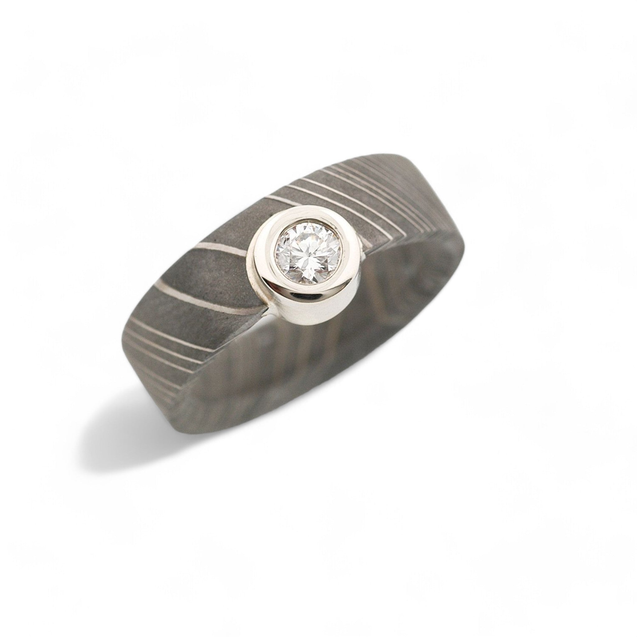 Stainless Steel Damascus with off center Palladium bezel and round white solitaire diamond.