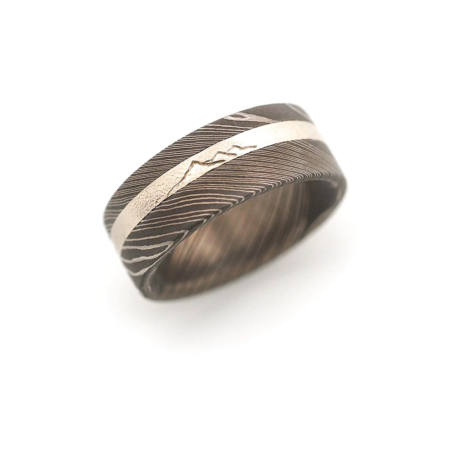 Custom Designed Stainless Steel Damascus band with 18K Yellow Gold inlay strip and mountain scene engraved accent.