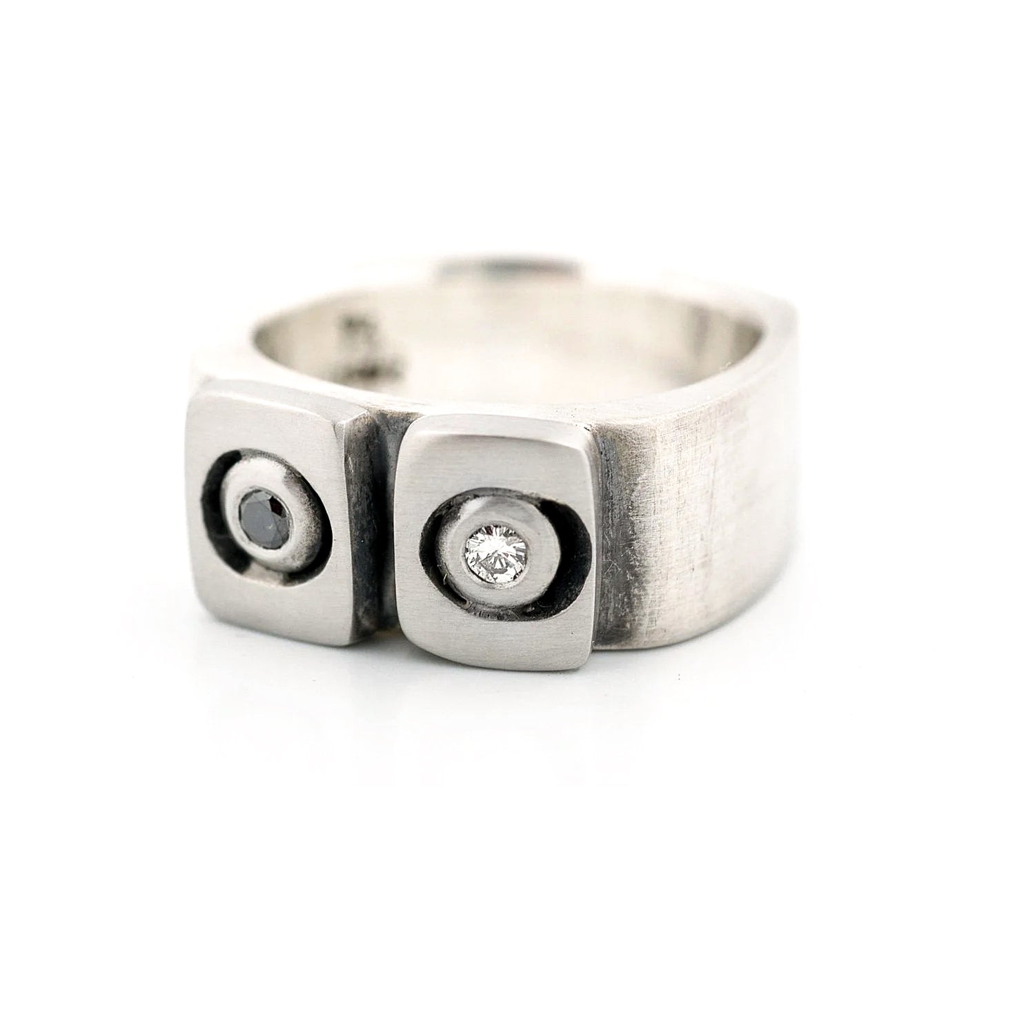 Sterling Silver squared band, with Stainless Steel top design and black and white flush set round diamonds. The stainless steel top comes from beloved pet's surgical implants.