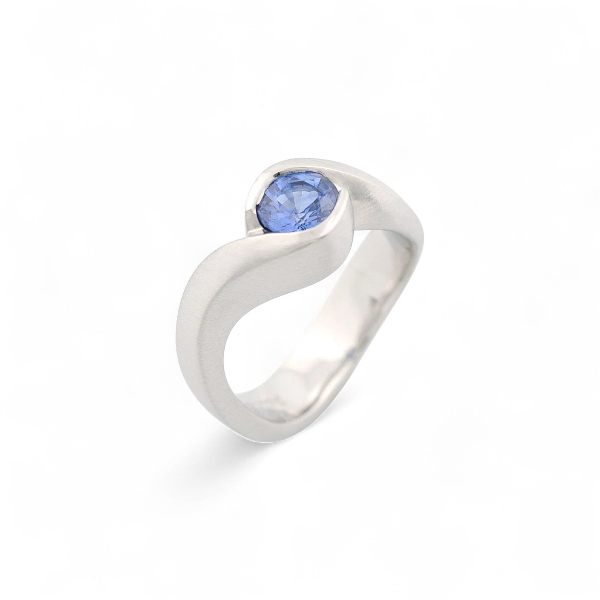 Blue Sapphire, Palladium, asymmetrical, ying-yang setting.
