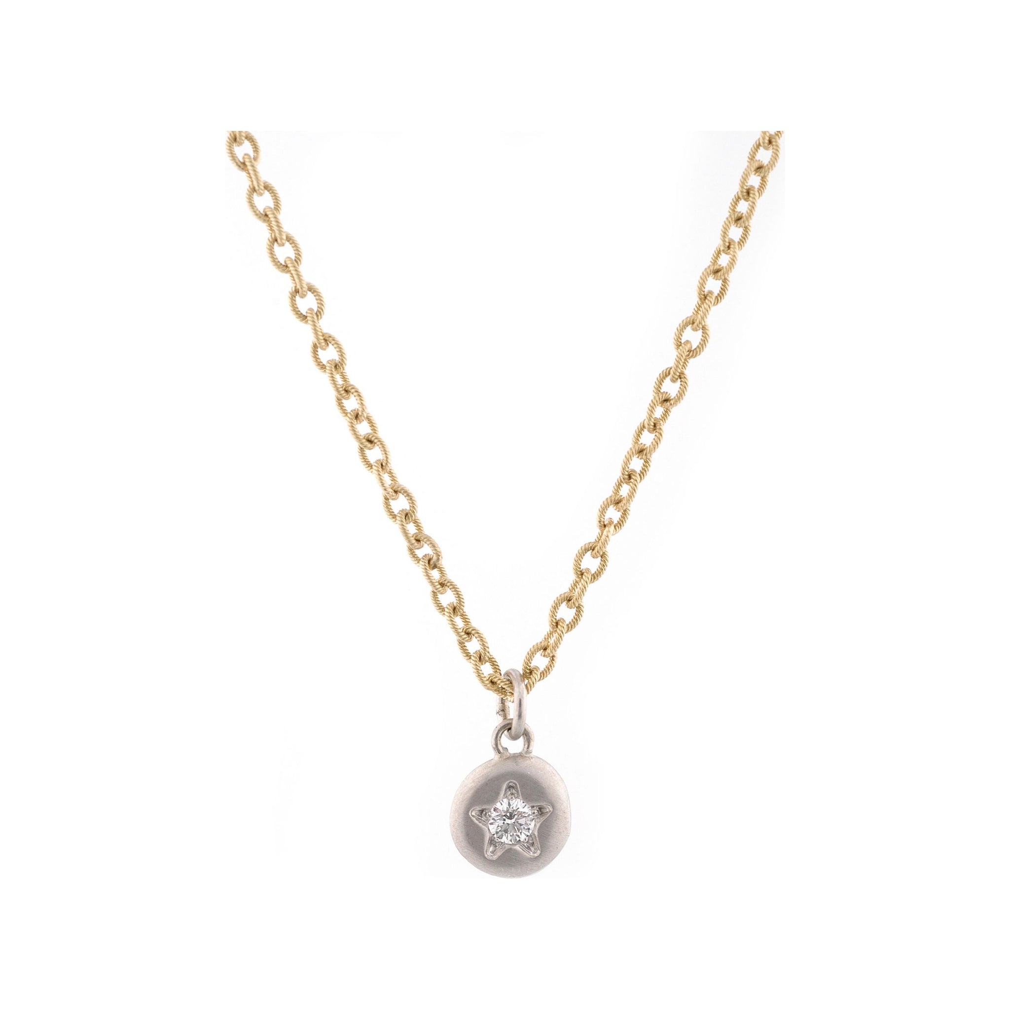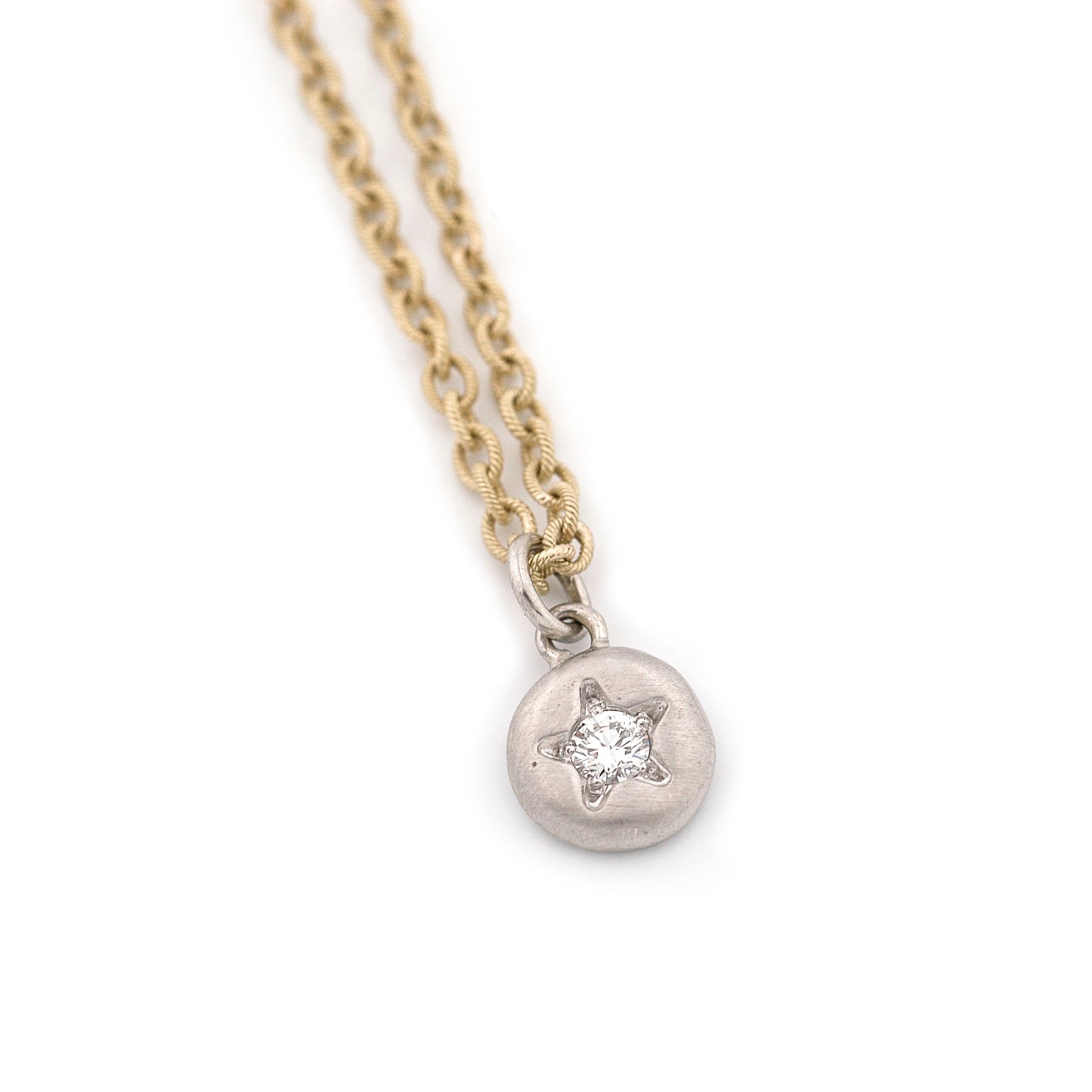 Tiny, forged platinum drop, stamped with a star and finished with a bead-set ideal cut diamond. Suspended from a custom yellow gold chain.