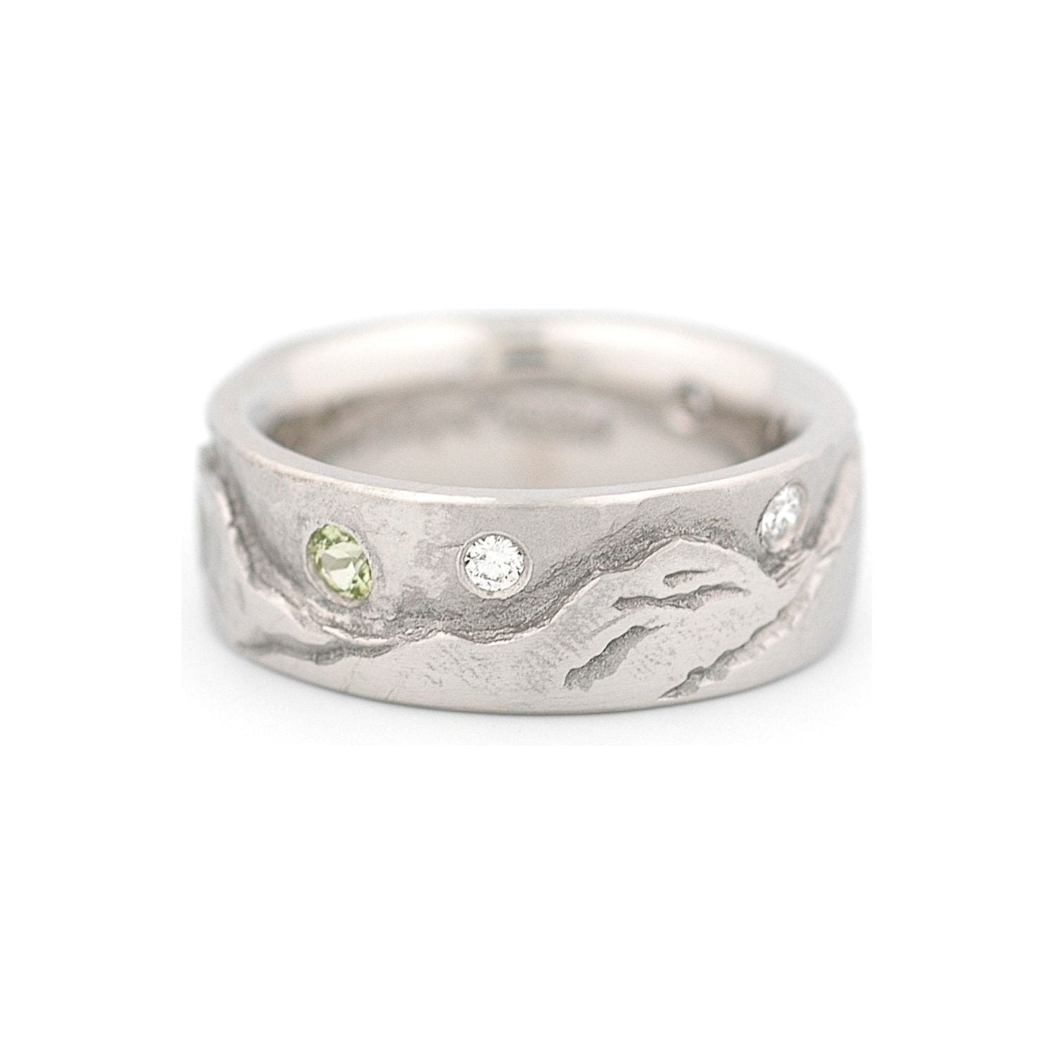 Custom Palladium comfort fit, Three Sisters Mountain range band. Flush set Peridot and white diamond accents.