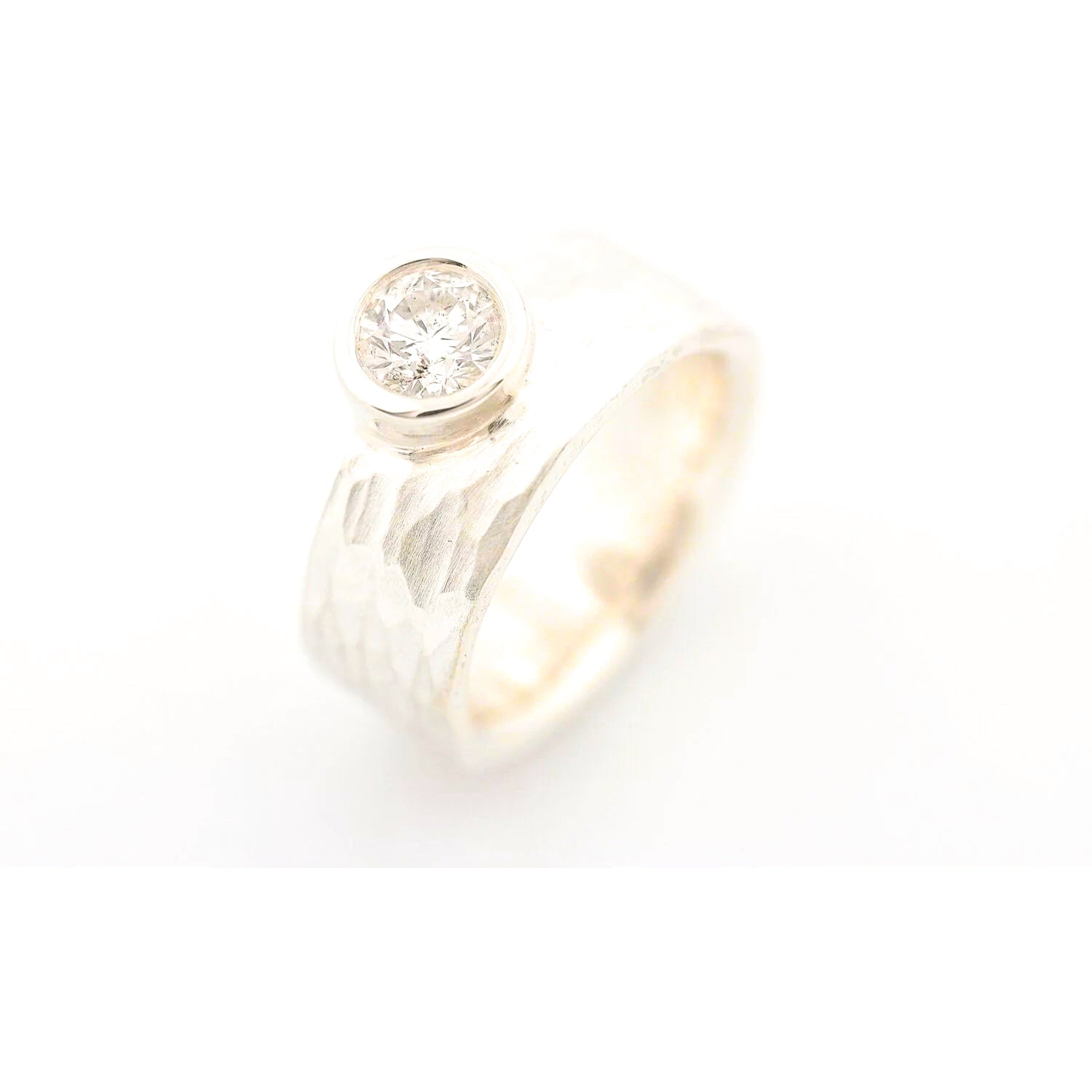 Platinum sterling silver band with ball peen texture and bezel set with a .37 ct white diamond solitaire.