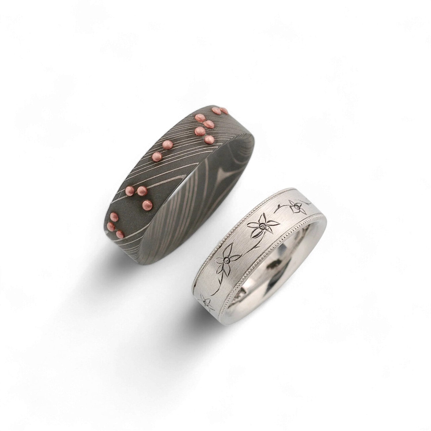 Custom designed and engraved Palladium band and Damascus Steel band with Copper accents.