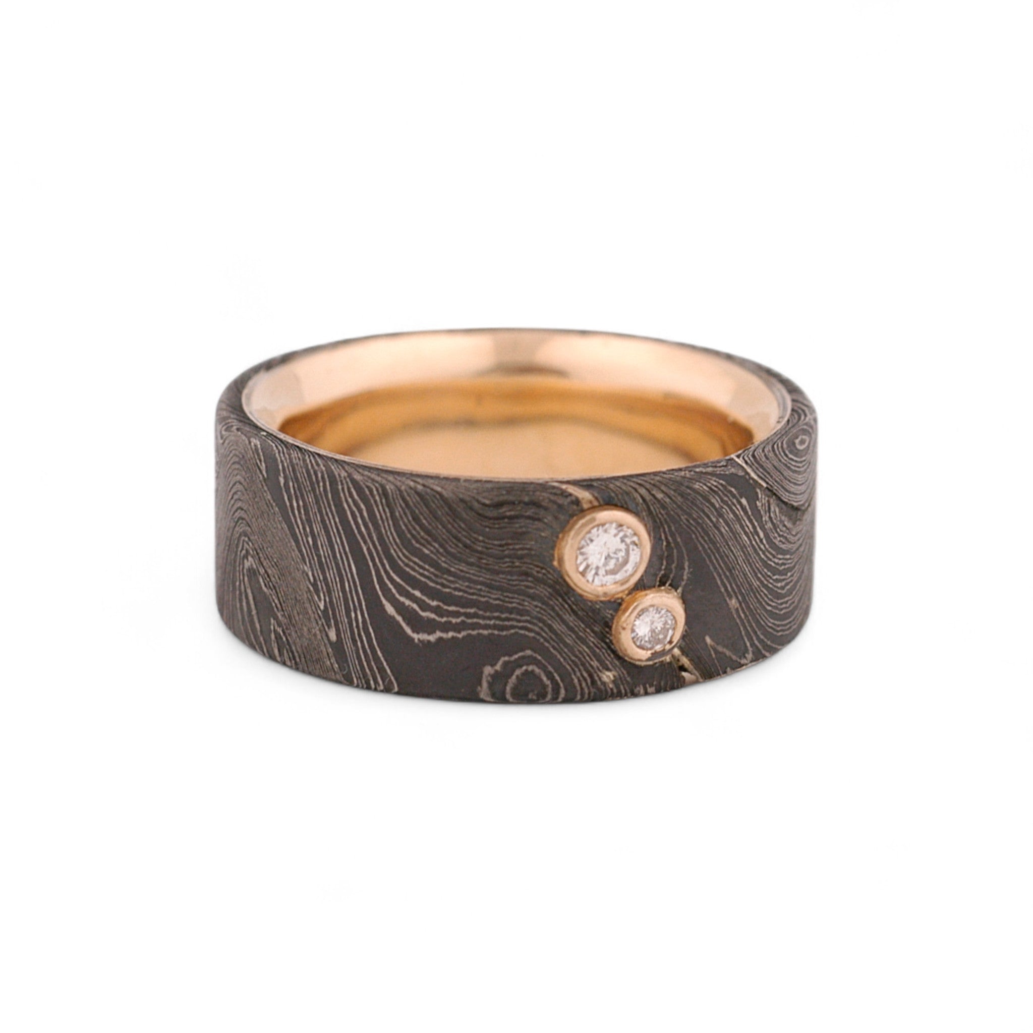 Forged and fabricated from clients father's damascus billet. The liner is from heirloom gold. Diamonds.