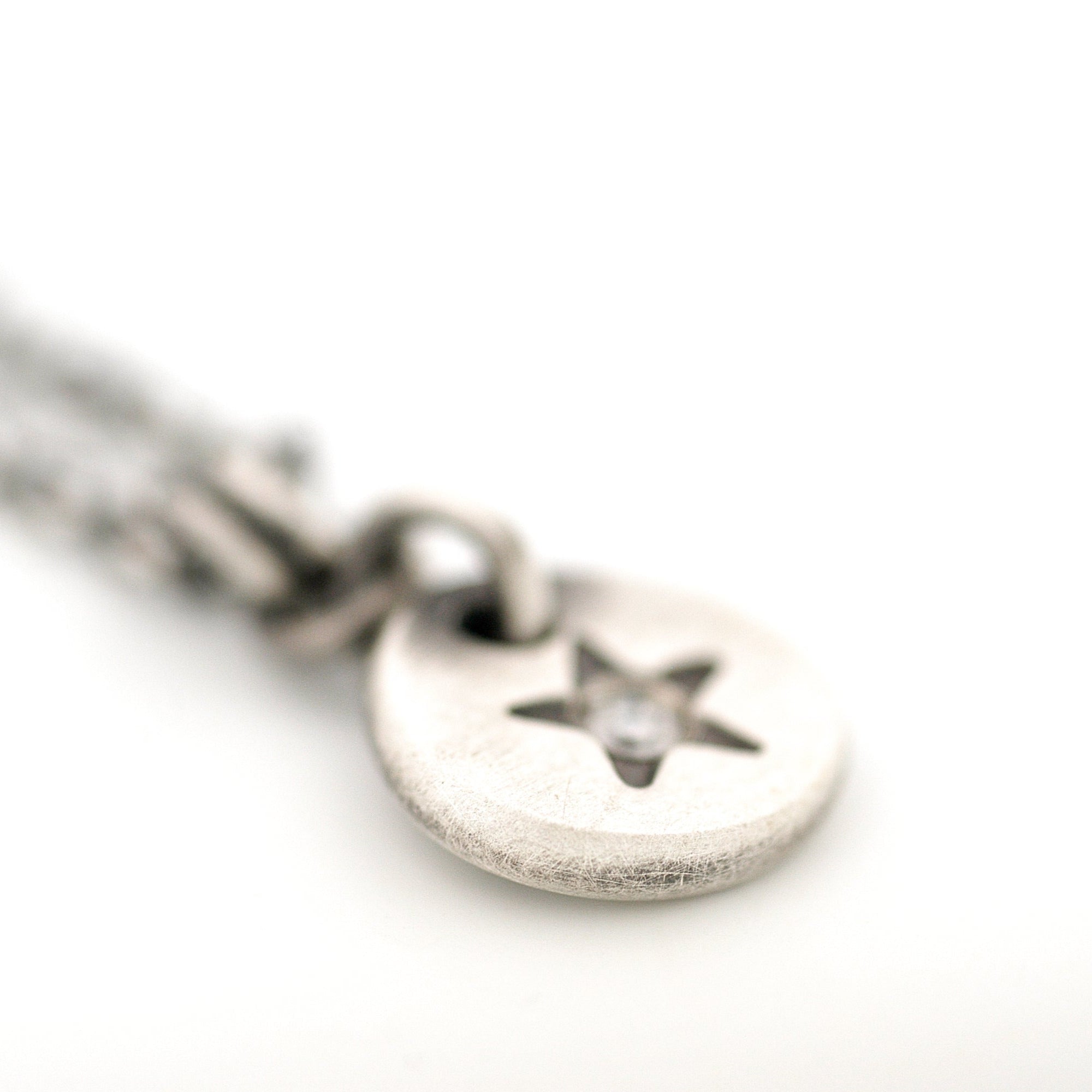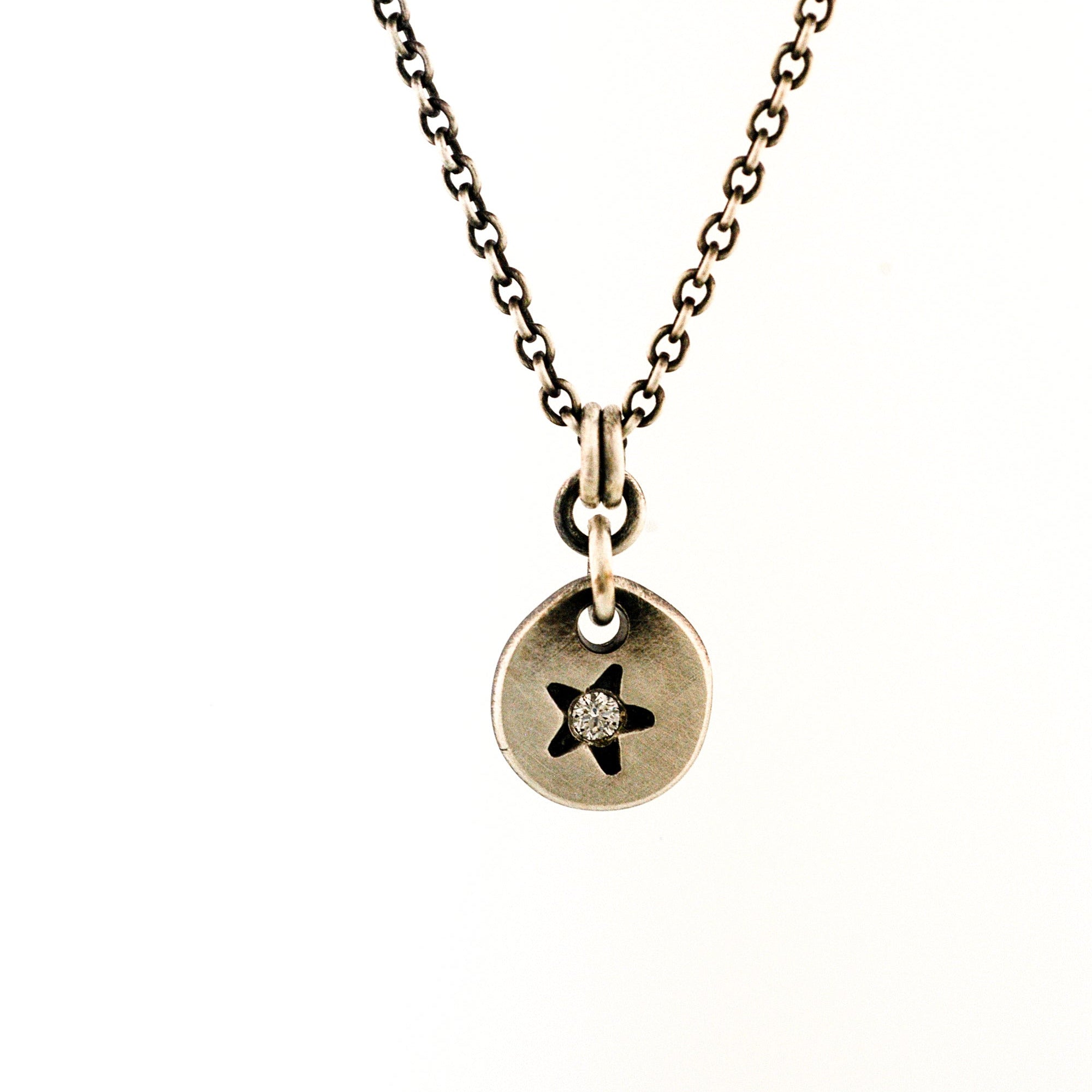 It features a flush-set ideal cut diamond alongside a delicately hand-stamped perfect star. Suspended on a lightly oxidized and brushed sterling silver cable chain, the pendant measures 1/2” in width and 3/4” in length including the bale.