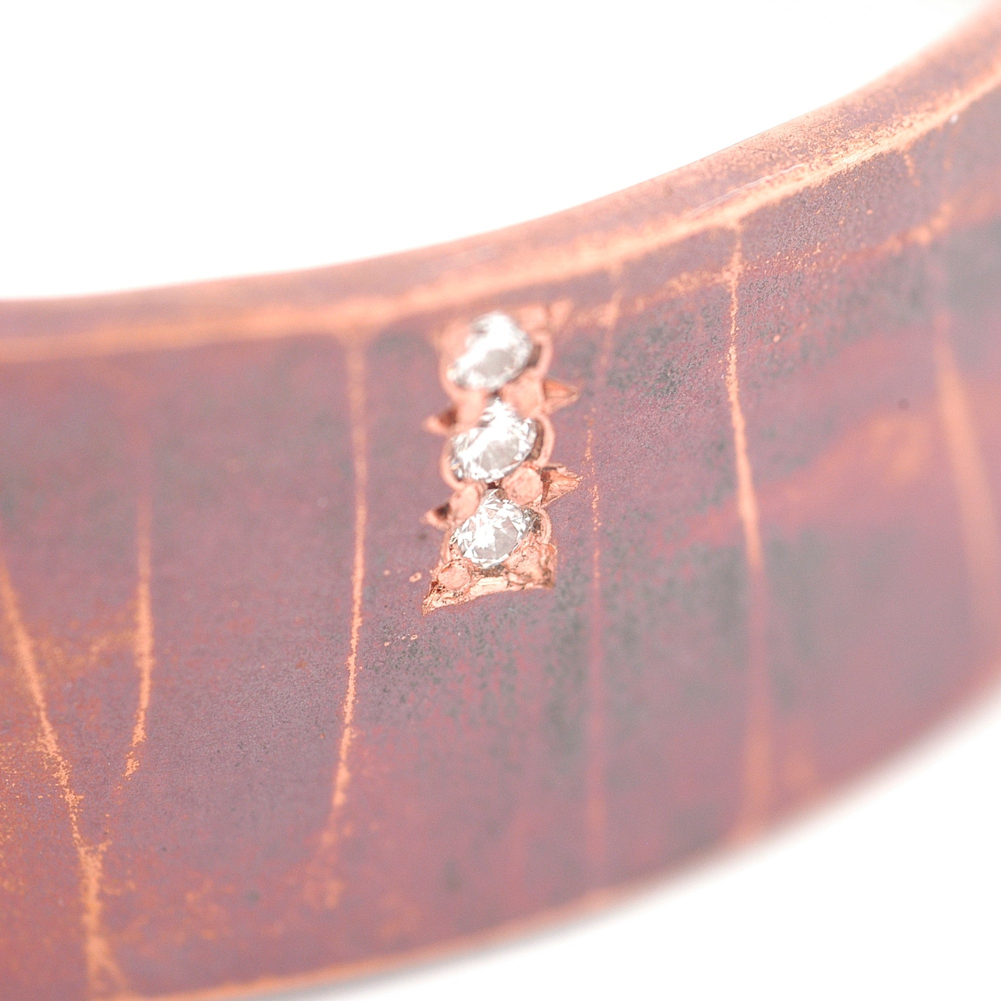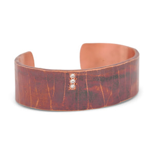 Forged Series copper cuff with incredible juicy cherry red patina finish and hand-hammered leather texture with a row of three brilliant ideal cut Diamonds.